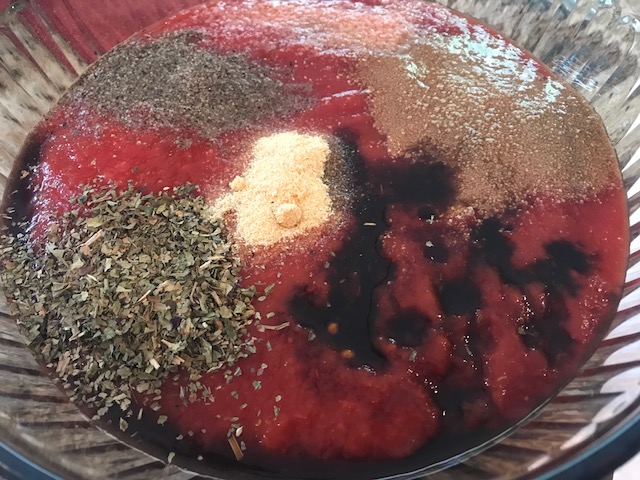 2. Mix together tomato sauce, basil, garlic powder, onion powder, brown sugar, Worcestershire sauce and lemon juice. Add ½ cup of the sauce on the bottom of a 9×13 oven-proof pan. Set aside.