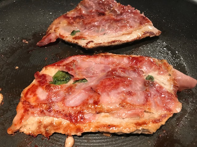 - 3. In a large oven-proof skillet over medium-high heat, melt 2 tablespoons of butter. Add the two scallopini to the skillet with the sage leaves side down. Cook for 3 minutes, until the Prosciutto is crispy. Carefully flip the scallopini and cook 2 minutes on the second side. Place the skillet in the oven and cook 5 minutes.