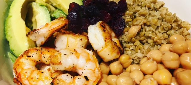 These types of bowls are all the rave right now and for good reason – they’re delicious and so versatile! I like the start with a grain or pasta, this time I’m using freekeh, and add whatever staples you have on hand. Here’s I’m using sliced avocado, canned chickpeas (don’t hate), leftover pepper jack cheese, cranberries and shrimp I thawed from the freezer that I used blackening spices on. Drizzle my favorite dressing and I was good to go in the time it took to cook the freekeh!
