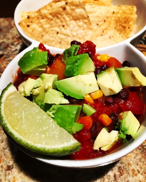 While winter’s been mild here so far in New Jersey, I’m still craving hearty, comforting food. In my continued effort to ‘prep Sunday – eat throughout the week’, this week, I’ve made a meatless chili that was uber satisfying and can be used in various ways during the week. I used it as dip for chips during the football game and topped a baked sweet potato with it for lunch (see photos).