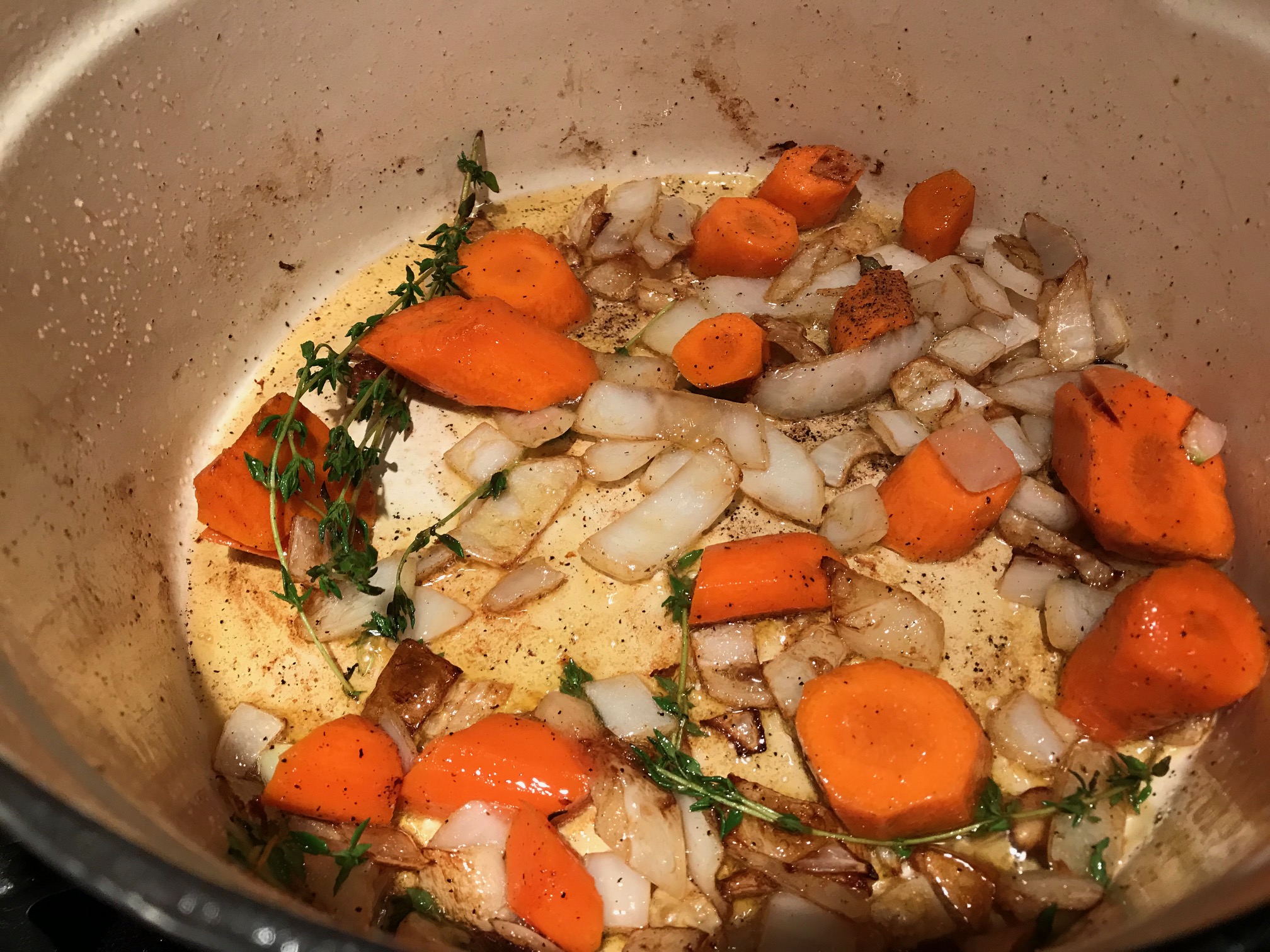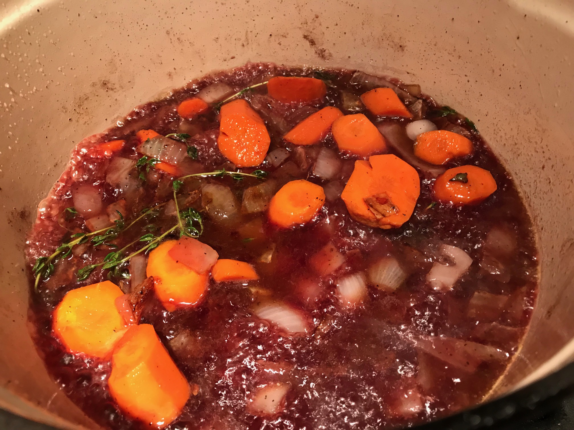- Lower the heat to medium-high, add the onion and carrots and cook for 5 minutes until slightly-browned, stirring occasionally. Add the mushrooms and continue cooking for another 3 minutes, until mushrooms have softened. Add the tomato paste and cook for a minute. Add the wine and broth and scrape all the brown bits that have formed on the bottom of the pot (the fond). Add the bay leaves, the thyme and the seared short ribs to the pot then cover and place in the oven to braise for 4-6 hours. Check that the cooking liquid doesn’t seem dry every 30 minutes. If liquid seems low, add ½ cup more beef broth.