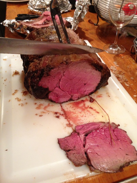 - Place the roast, still on the rack in the roasting pan, in a 150-175 degree Fahrenheit oven (some ovens won’t stay on at 150 degrees, so raise to 175 degrees if that happens). I cook mine at 150 degrees. Place an instant-read thermometer in the center of the roast (make sure it doesn’t touch a bone). Cook for five ½ – six ½ hours, until the thermometer reads 120 degrees for rare, 130 for medium-rare or 135 for medium. Anything more cooked than medium is a sin, don’t be sinful. For a five-pound roast, mine took just over 6 hours.