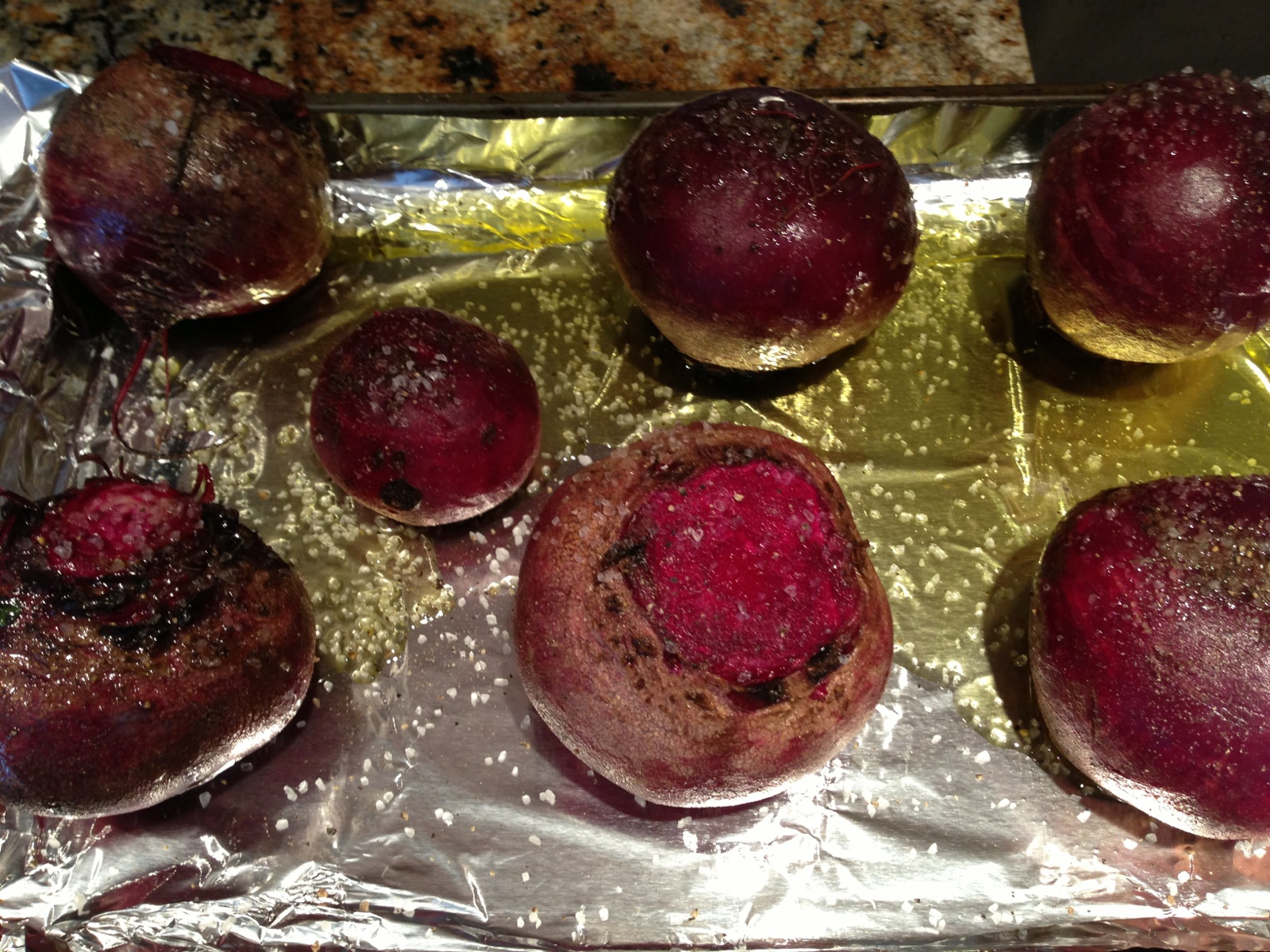 - Place the beets on a baking sheet lined with aluminum foil. Bring up the ends of the foil to create a packet for the beets. Drizzle with olive oil, thyme, salt and pepper. Wrap the foil over the beets and roast for 30 – 45 minutes, depending on the size of the beets. When cooked, a knife inserted in the beets should go in with ease.
