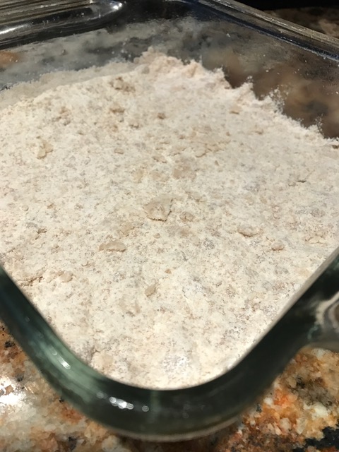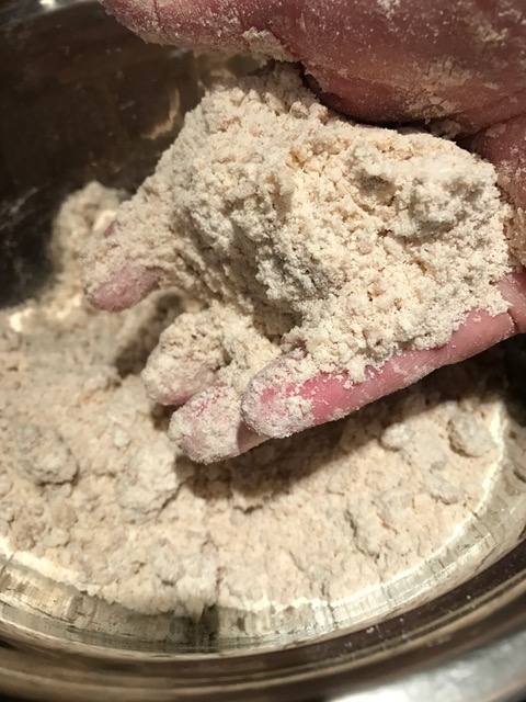 - In a medium bowl, combine the flour, ½ cup of brown sugar and the ¼ cup of butter. Use a pastry cutter or two better knives to combine, until mixture is crumbly and butter is the size of peas – i finish the job with my hands, working quickly not to melt all the butter. Press the mixture into bottom of the prepared pan.